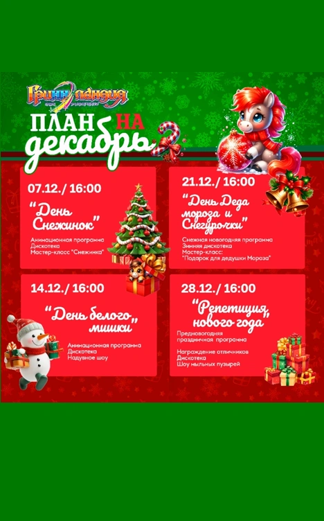 Приглашаем вас окунуться в атмосферу зимней сказки и провести декабрьские воскресенья ярко, весело и незабываемо. В сердце города — в ТРЦ «МегаГринн» — вас ждут удивительные события, наполненные волшебством, смехом и тёплыми моментами.