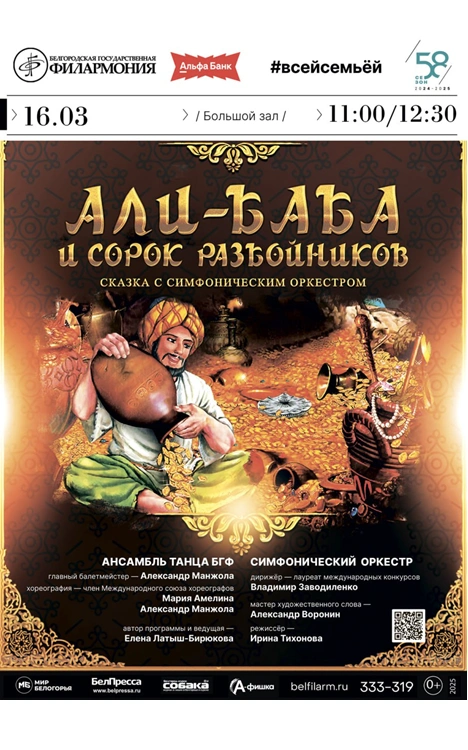 Приглашаем вас на красочное путешествие в сказочную страну Востока – Персию! Вас ждут герои известной сказки «Али-Баба и сорок разбойников»: находчивый Али-Баба и прекрасная Зейнаб, жадный Касым и сладкоголосая Фатима, весёлый башмачник Мустафа и разбойники во главе со своим атаманом Хасаном! В музыкальной сказке прозвучат популярные фрагменты симфонических произведений А. Бородина, М. Мусоргского, Н. Римского-Корсакова, А. Глазунова, А. Хачатуряна. Перед вами предстанет загадочный Восток в головокружительном действе красивых мелодий и зажигательных ритмов восточных танцев!
