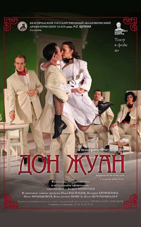 История Дон Жуана, которую вы не знаете, заставляющая по-новому взглянуть на знаменитый сюжет. Спектакль идет в исполнении пяти молодых и темпераментных артистов: Валерии Ерошенко, Нины Кранцевич, Ильи Васильева, Константина Мойсы, Ильи Штейнмиллера. Яркое и оригинальное оформление, музыка, пластика привлекут, без сомнения, внимание зрителей.