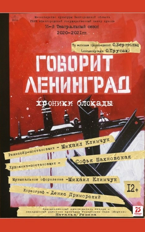 За создание спектакля для детей и юношества «Говорит Ленинград» по мотивам произведений О. Берггольц авторский коллектив Белгородского государственного театра кукол удостоен премии Министерства обороны Российской Федерации в области культуры и искусства за 2021 год в номинации «Театральное искусство».