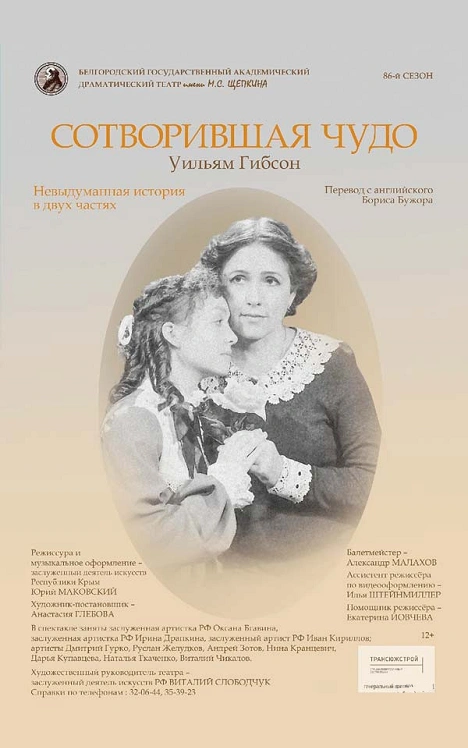 Пьеса «Сотворившая чудо» по одноимённой пьесе Уильяма Гибсона поставлена на щепкинской сцене впервые. Она основана на реальной биографии знаменитой писательницы Хелен Келлер (1880–1968).