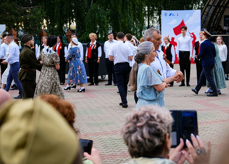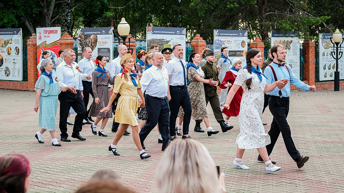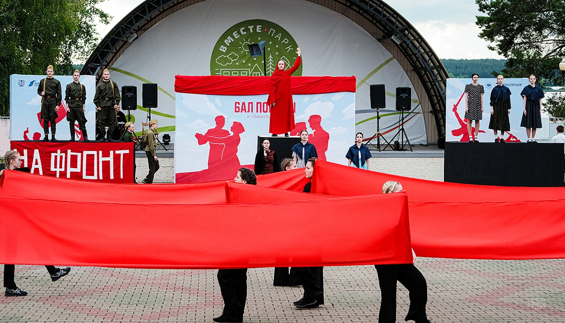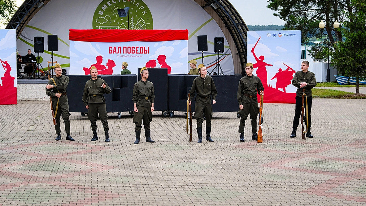 Затем началось главное событие — масштабная театрализованная постановка. Одна за другой сменяли друг друга сцены из мирной и фронтовой жизни, звучали знакомые каждому с малых лет военные песни, а участники бала кружились в танце. Отдельные номера сливались в единый спектакль, который завершился фейерверком и ощущением настоящего большого праздника.