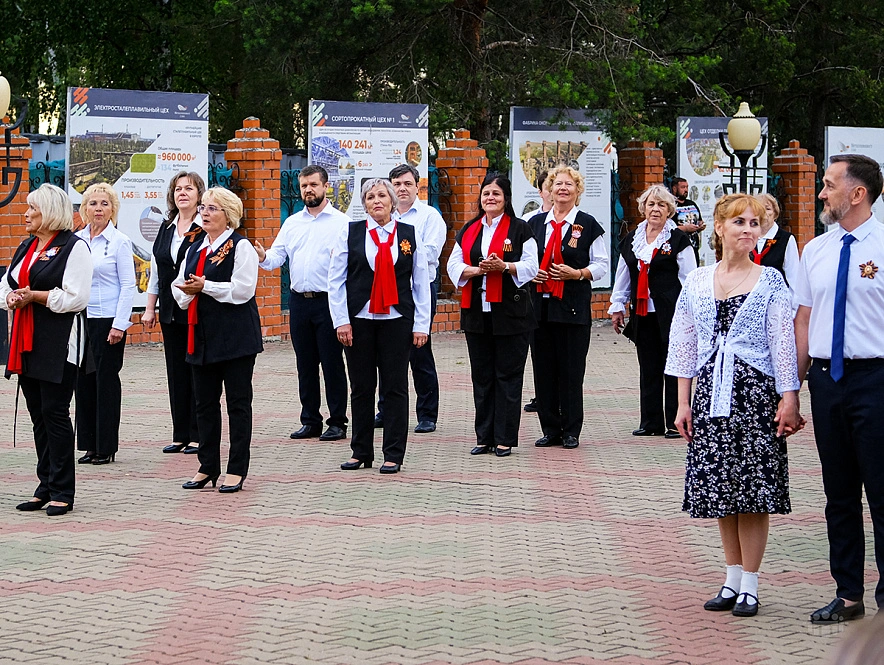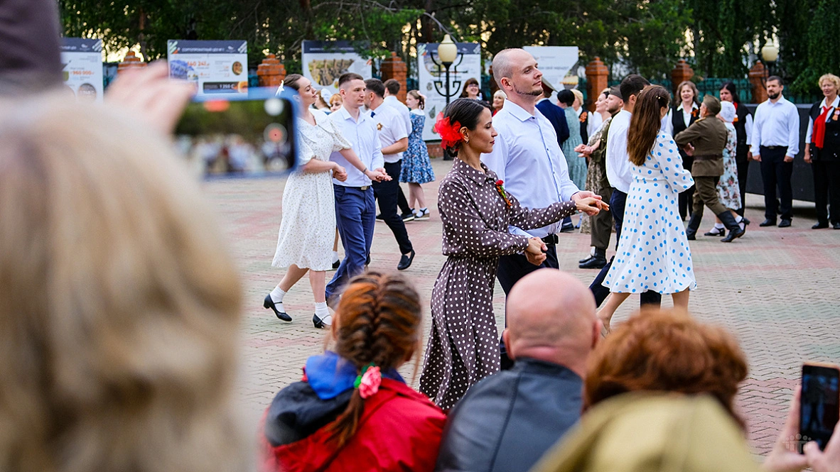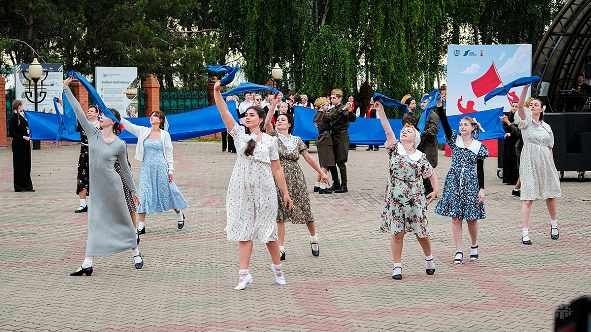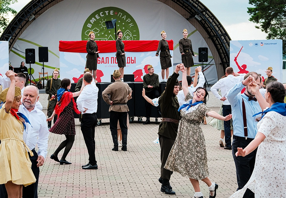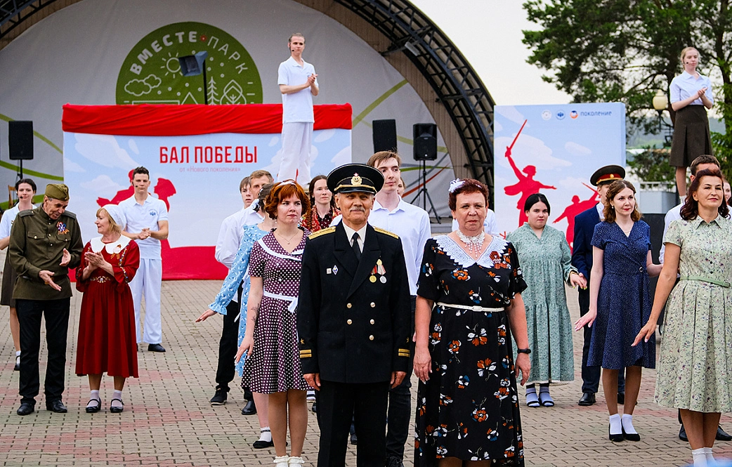 Затем началось главное событие — масштабная театрализованная постановка. Одна за другой сменяли друг друга сцены из мирной и фронтовой жизни, звучали знакомые каждому с малых лет военные песни, а участники бала кружились в танце. Отдельные номера сливались в единый спектакль, который завершился фейерверком и ощущением настоящего большого праздника.