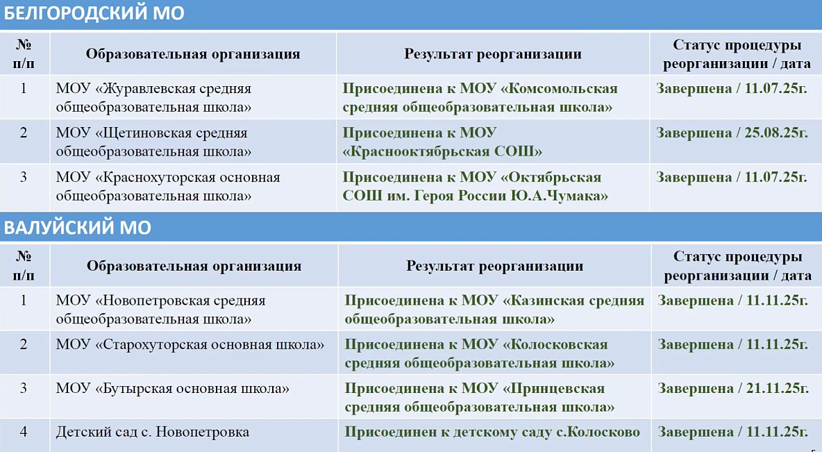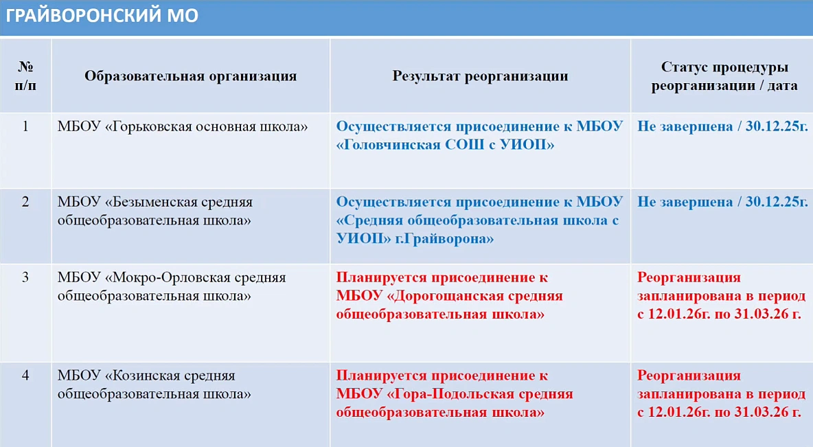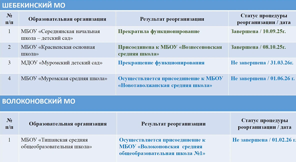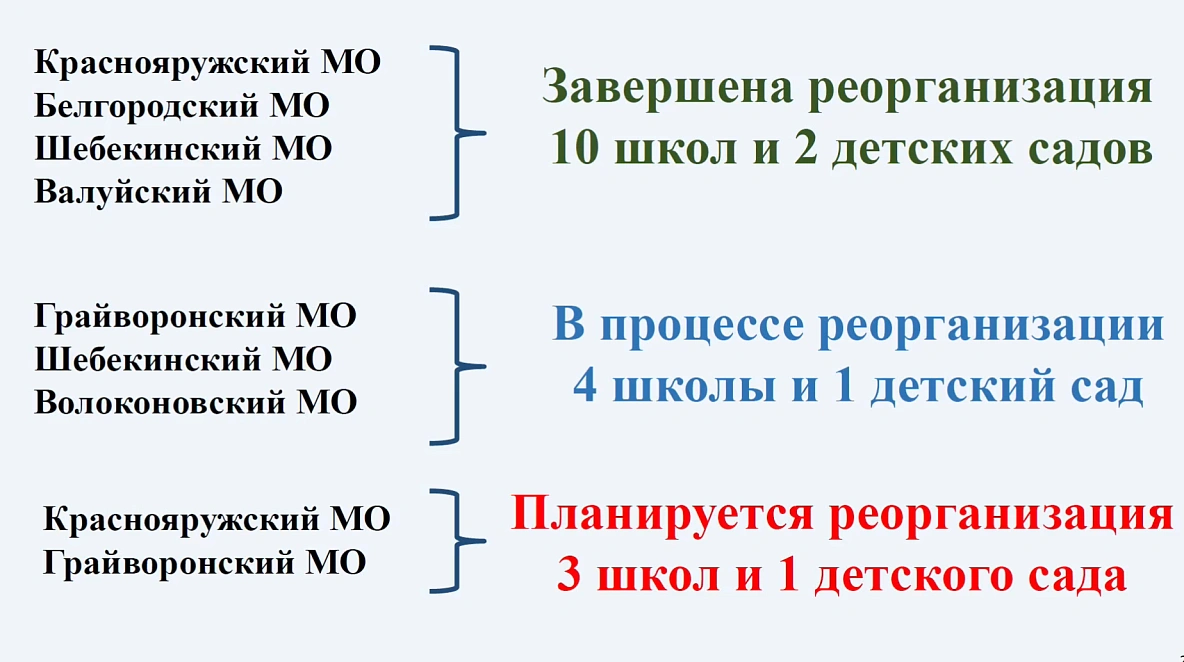 По пяти образовательным организациям из Грайворонского, Волоконовского, Шебекинского процедуры слияния с другими юрлицами уже запущены. Ещё по четырём организациям запуск реорганизации — в планах.