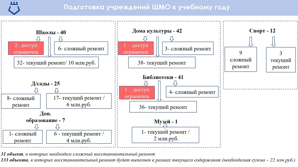 В целом текущий ремонт требуется для 133 социальных объектов (школы, детские сады, школы искусств, спортивные объекты, библиотеки, дома культуры) Шебекинского округа. На это муниципальные власти намерены потратить 22,2 млн рублей. Сложный ремонт нужен на 31 социальном объекте.