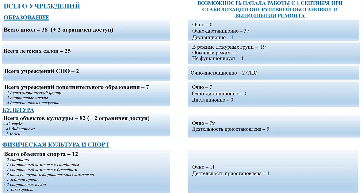 Чиновник говорит, что из 40 школ муниципалитета две находятся в закрытых населённых пунктах. В случае спокойной оперативной обстановки 37 образовательных учреждений будут с 1 сентября работать в очно-дистанционном формате, одно – на полном дистанте.