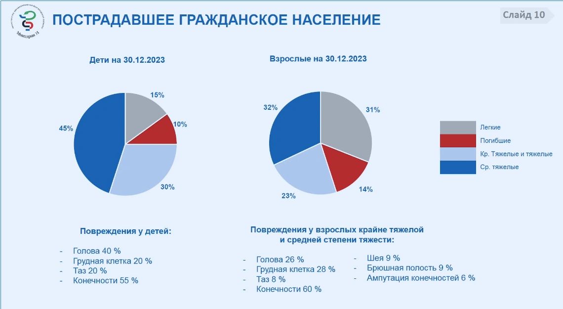 Наибольшее число жертв было 30 декабря 2023 года, когда ВСУ ударили снарядами по центру Белгорода. Тогда пострадали 137 человек, 20 из которых – дети. Треть раненых была в тяжёлом состоянии. Погибли 25 человек. 6% взрослых, раненых в ходе атаки, пришлось пережить ампутацию конечностей. Чаще всего повреждения приходились на голову и грудную клетку.