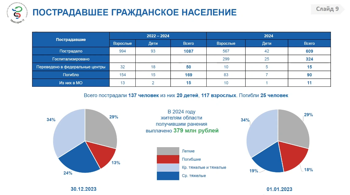 В 2024 году власти выплатили 379 млн рублей людям, пострадавшим при атаках ВСУ на Белгородскую область, рассказал министр белгородского здравоохранения Андрей Иконников. Деньги полагаются мирным гражданам, получившим повреждения средней и тяжёлой степени. Всего в 2024 году пострадали 609 человек, 15 из них перевозили в федеральные медицинские центры.