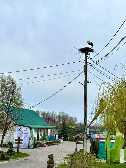 В Старооскольский зоопарк снова прилетели аисты. Птицы свили гнездо — на этот раз рядом со статуей большого птеродактиля.