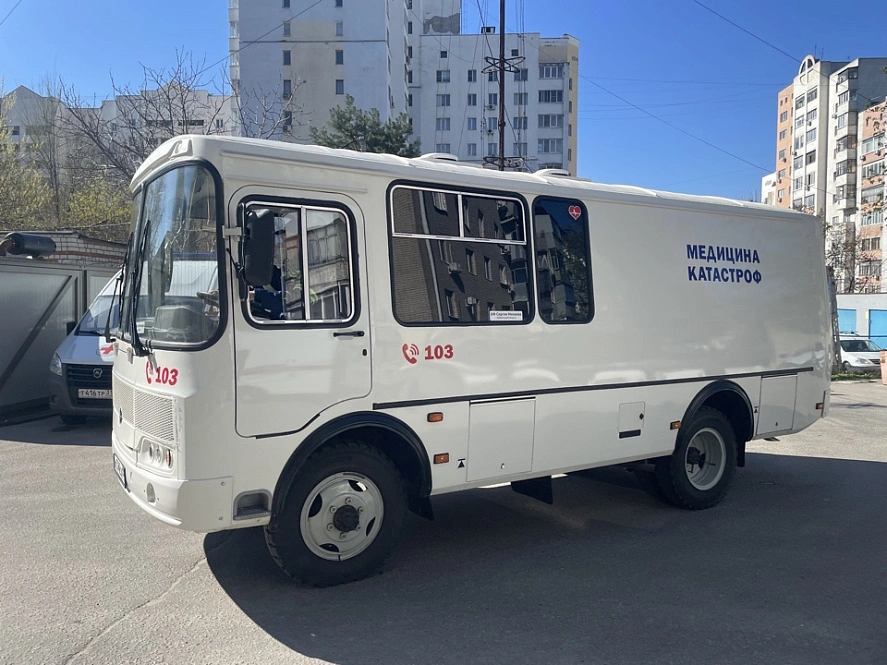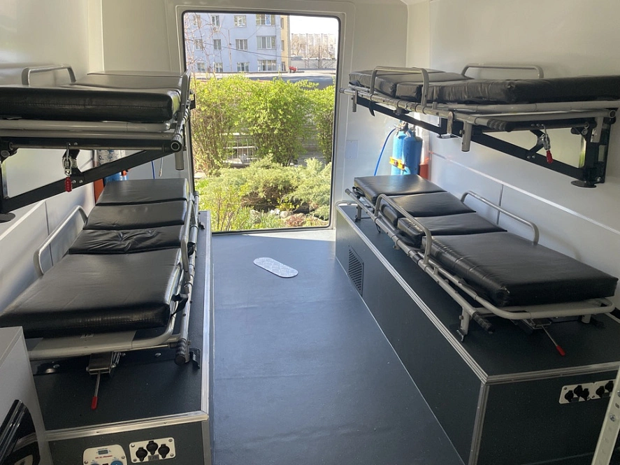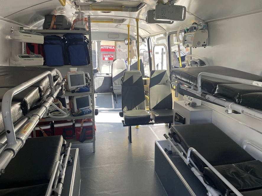 Новый спецавтомобиль на базе автобуса ПАЗ повышенной проходимости предназначен для транспортировки раненых. Здесь есть места для 4 носилок, места для маломобильных, для требующих оперативной терапии пострадавших, и для 6 пациентов средней степени тяжести. За один раз можно перевезти 10 человек.