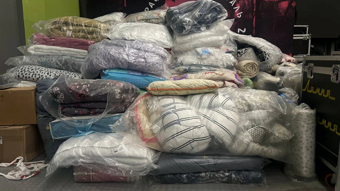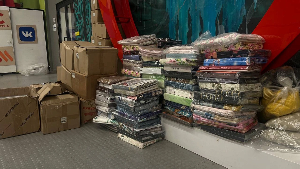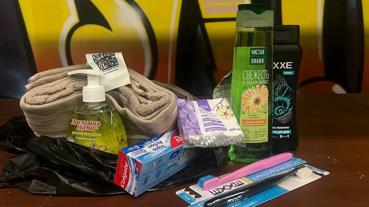 Также раздают постельное бельё и бытовую химию. Эти вещи привёз фонд «Святое Белогорье против детского рака», чтобы разгрузить очереди на своём пункте выдачи. В набор средств личной гигиены входят жидкое мыло, шампунь, гель для душа «2 в 1» для мужчин, две зубные щётки, ватные палочки, зубная паста и два полотенца. Также есть наборы с детскими средствами ухода и питанием.