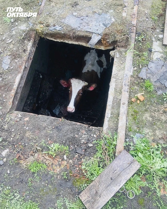 Они рассказали, что бурёнку по кличке Марта после зимы выпустили из коровника на улицу. Она чего-то испугалась, вырвалась из рук и побежала. На пути оказался подвал, накрытый листом железа и деревяшками. Под тяжестью бурёнки перекрытия прогнулись, и животное скатилось вниз как на санках.