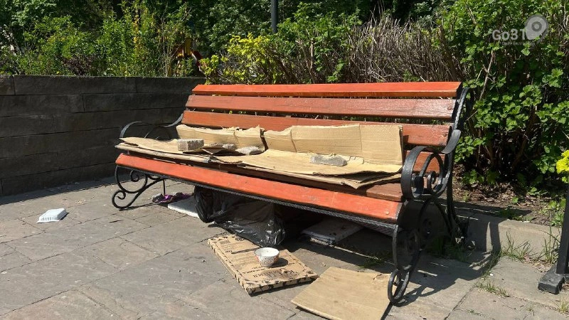 Мы решили посмотреть, как проходит реконструкция сквера. Работы ведутся пока только на одной стороне. Также мы заметили биотуалет на центральном участке сквера и оригинальную лавочку. Около неё стоят около четырёх мисок с кормом и водой, снизу пенопласт, на котором коробка, накрытая чёрным пакетом. А сверху соорудили импровизированную крышу – картонки, которые придерживают булыжники.