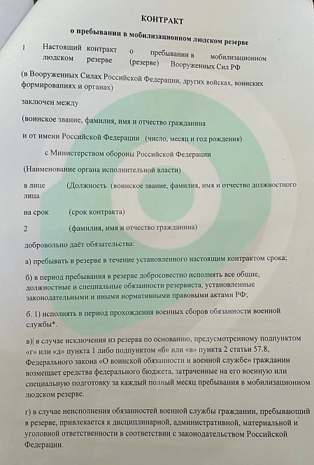 Документ «Контракт о пребывании в мобилизационном людском резерве», который предлагают ополченцам, не содержит ни срока, ни лица, ни положений, которые будут защищать бойцов в случае ранения или гибели. Дату, как сказали ополченцам, поставят позже, после подписания. И – самое главное – участники добровольной дружины и без того пребывают в мобилизационном резерве.