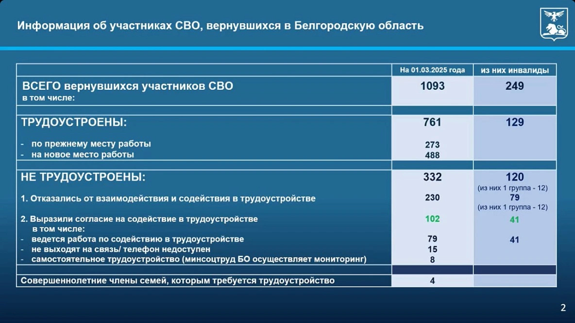 В ходе своего отчёта Максим Гусев отметил, что на 1 марта в Белгородскую область вернулись 1 093 участника СВО, из них 249 бойцов с инвалидностью. Это составляет почти четвёртую часть от общего количества вернувшихся белгородцев.