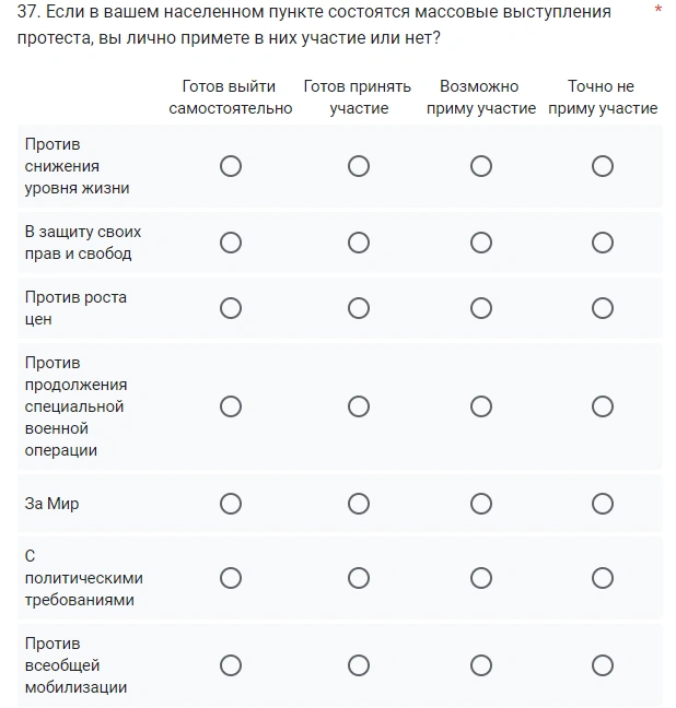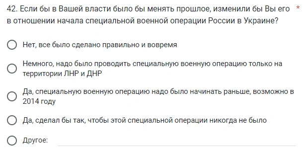 В конце студентов спрашивают, в каких протестах они готовы участвовать: «за Мир», «против продолжения СВО», «против всеобщей мобилизации». А также поменяли бы они прошлое, чтобы отменить СВО.