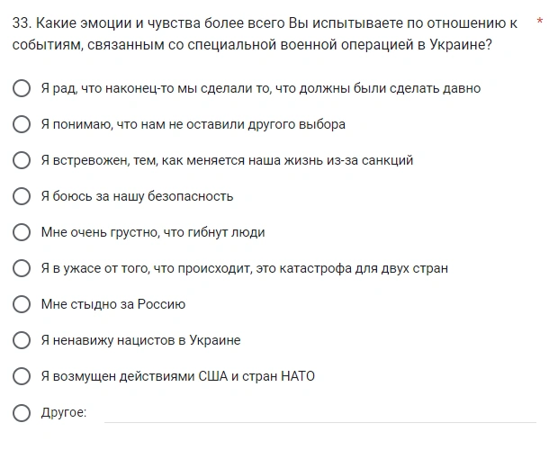 После этого вопросы переходят к теме СВО. Тут уже студентов просят ответить, насколько они солидарны с друзьями и родственниками в вопросах отношения к военной операции, какие настроения у их окружения и какие чувства испытывают они сами по отношению к СВО. Среди вариантов: «Я рад, что наконец-то мы сделали то, что должны были сделать давно», «Мне стыдно за Россию» и «Я ненавижу нацистов в Украине».