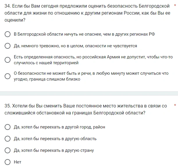 Также создатели опроса пытаются узнать у студентов, насколько они обеспокоены ситуацией в Белгородской области в связи с СВО, боятся ли они «начала Третьей мировой войны», «применения ядерного оружия» или «наступления на Белгородскую область».