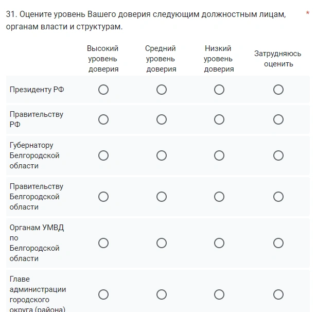 Читатели Go31 сообщают, что белгородским студентам присылают ссылки на опрос об экстремизме, где учащихся спрашивают о доверии властям и поддержке протестов. В опросе 60 вопросов, а пройти его настойчиво просят до 14 июля. Старосты групп при этом должны отчитаться куратору о том, кто прошёл опрос.