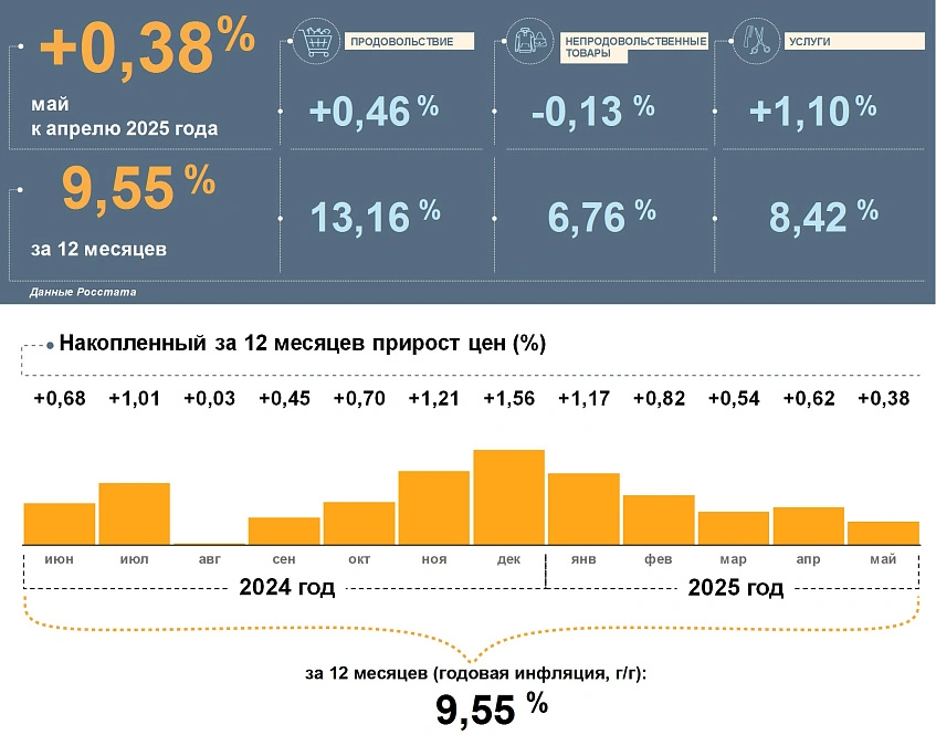 В мае цены в регионе выросли на 0,38%, а годовая инфляция достигла 9,55% – это чуть ниже общероссийских 10,23%.