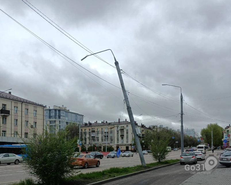 Читатели телеграм-канала Go31 прислали фото столба, который накренился в сторону проезжей части на «Родине» со стороны ТЦ «Славянский».