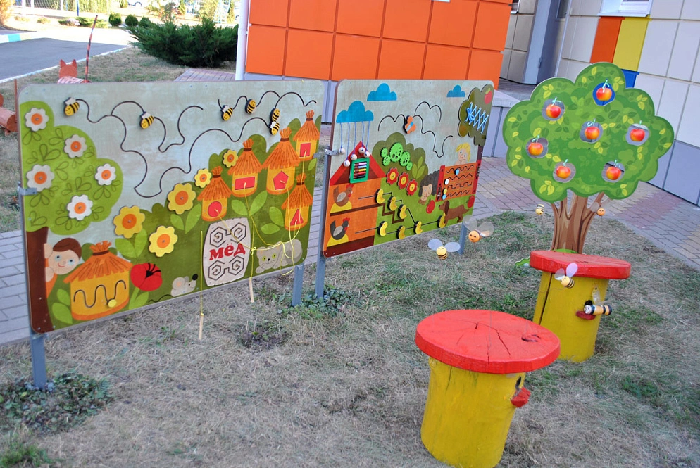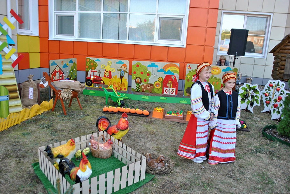 На новой площадке установлены макеты с имитацией погоды, грядок, муляжи животных, деревьев, сельхозпостроек, садового инвентаря, овощей и фруктов, что позволяет отражать реальную жизнь, воспитывать уважительное отношения к труду, а также демонстрирует его пользу для общества, вызывает интерес детей к работе.