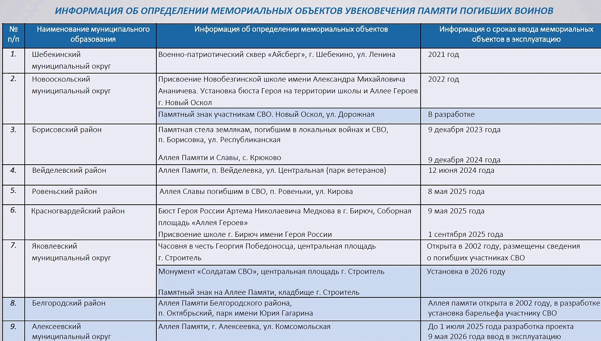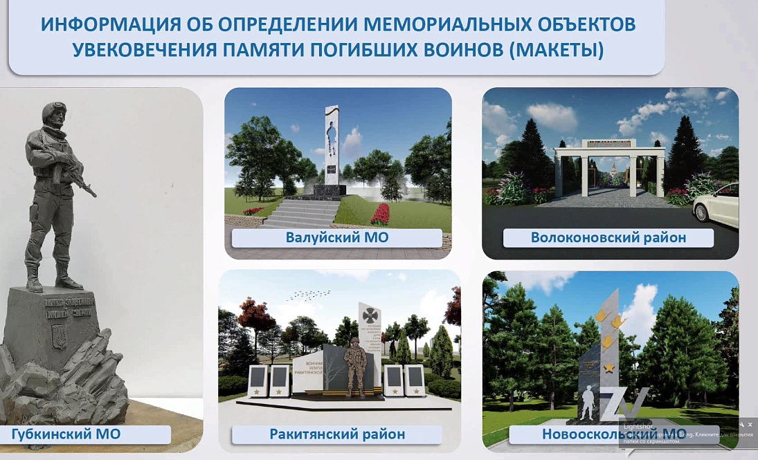 Кроме того, муниципальным чиновникам региона поручено организовать мемориалы погибшим ветеранам СВО. В нескольких районах памятники уже есть, в некоторых для них определены места и подготовлены проекты. В частности, в Новом Осколе мемориал предполагает установку буквы Z.