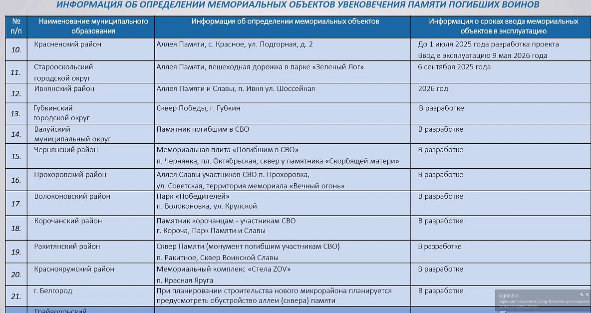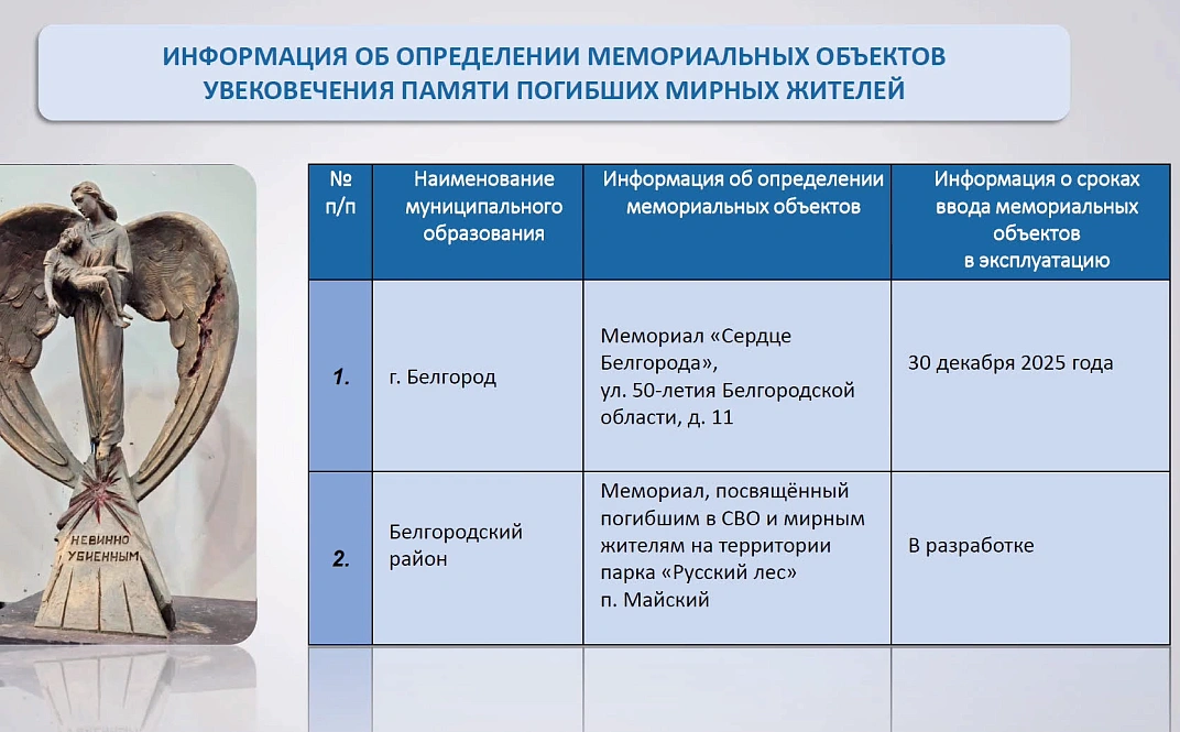 Также чиновники намерены организовать мемориалы, посвящённые памяти погибших из-за проведения СВО мирных жителей. Пока что известно, что памятники появятся в Белгороде и Белгородском районе.