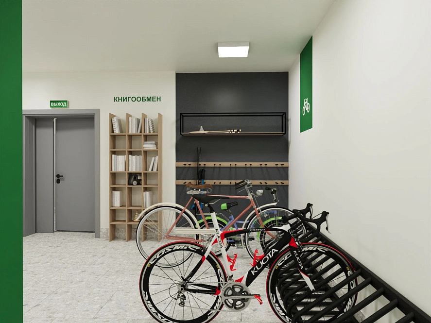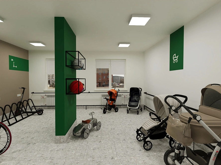Обустроенные колясочные комнаты, где можно организовать комфортное хранение не только колясок, велосипедов, самокатов, но и негабаритного и спортивного инвентаря, освободив пространство квартиры.