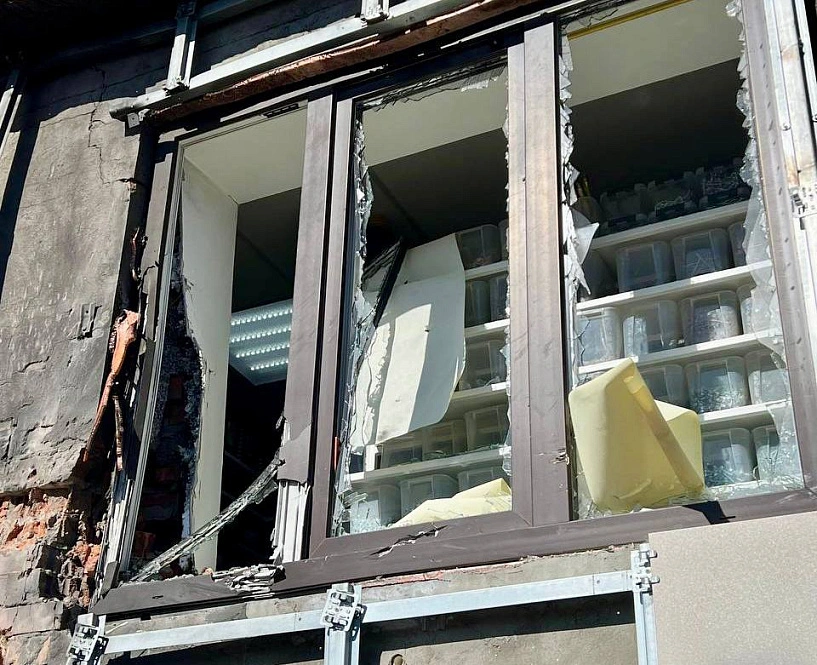 В результате повреждён фасад и выбиты три окна одноэтажного здания магазина строительных материалов. Все службы на месте. Управа обходит территорию. Информация уточняется,