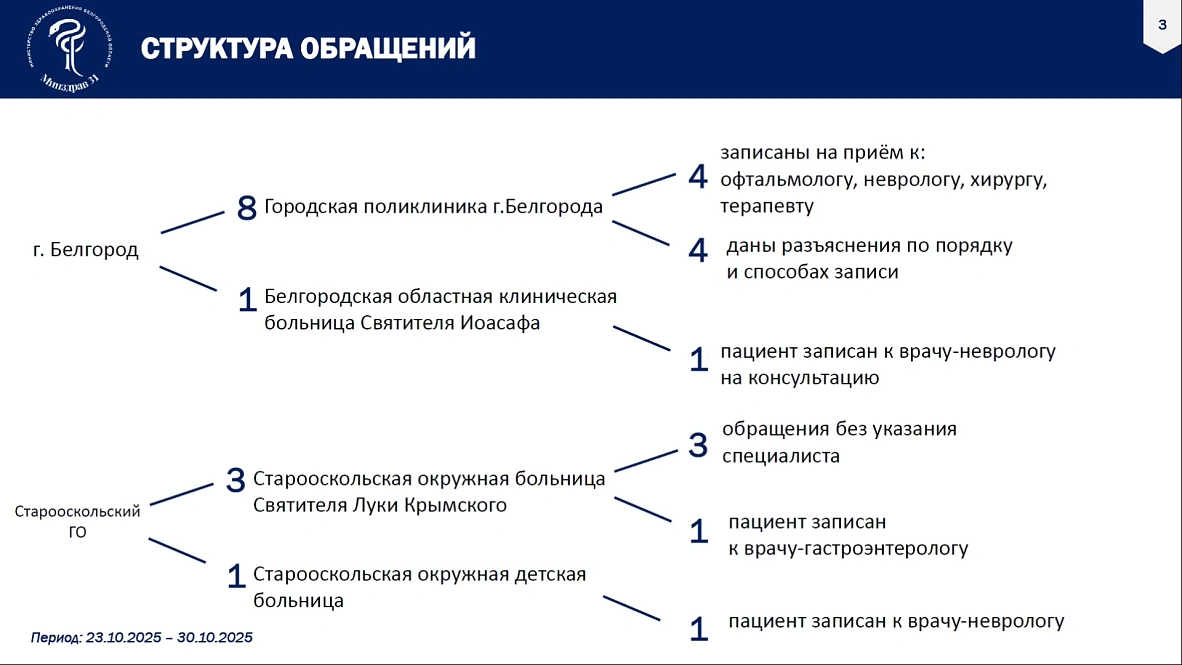 Министр здравоохранения региона Андрей Иконников заявил, что большинство обращений от жителей Белгорода — девять. Также о проблеме рассказывали белгородцы из Старооскольского округа, Белгородского района и Алексеевского округа. Чиновник сообщил, что жителей записали на приём в зависимости от того, какие специалисты им были нужны. Чаще всего они не могли попасть к врачам узких специальностей, например, к неврологу, хирургу, офтальмологу.