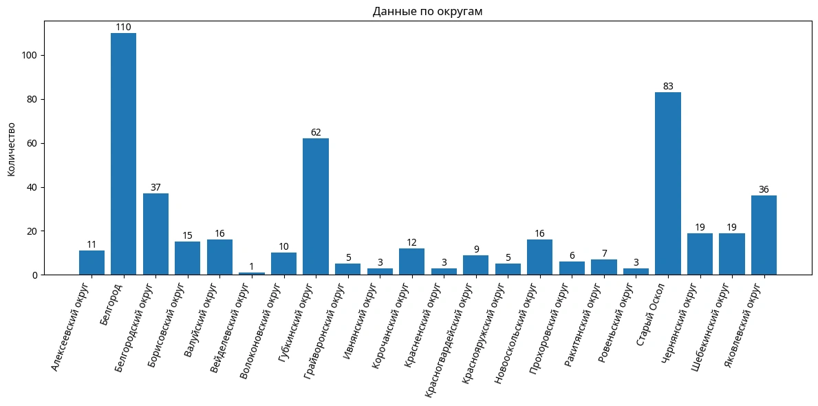 Больше всего преступников оказалось в Белгороде — 110 лиц. На втором месте по количеству правонарушителей Старый Оскол — 83 жителя, на третьем — Губкинский округ, где поймали 62 преступника. Четвёртым по числу нарушителей оказался Белгородский округ — 37 жителей. Пятёрку округов закрывает Яковлевский округ, где полицейские задержали 36 преступников. Более подробную статистику можно увидеть на графике.