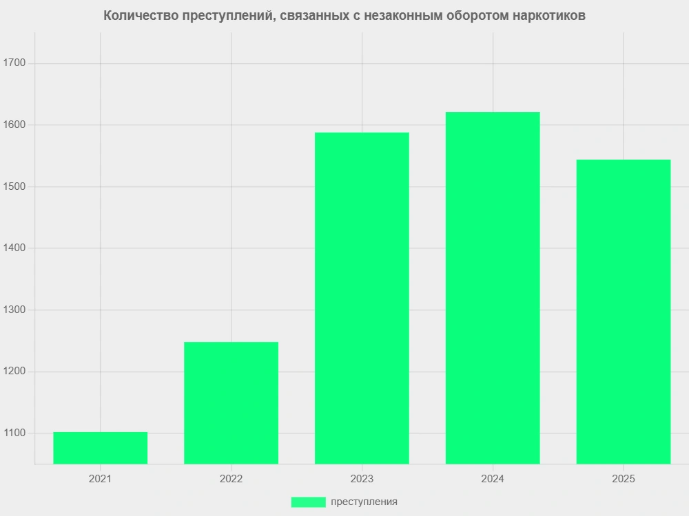 В 2025 году в регионе выявили 1 544 факта незаконного оборота наркотиков. При этом ранее, в 2024 году, показатель был выше — 1 621 преступление. В 2023 году белгородцев ловили за незаконным оборотом наркотиков 1 588 раз, в 2022 году — 1 248 раз. Меньше всего преступлений произошло в 2021 году — 1 102 факта.