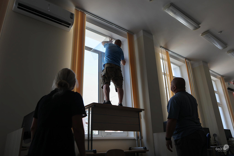 Из-за опасности обстрелов в белгородских школах оклеивают окна бронеплёнкой. Фоторепортаж