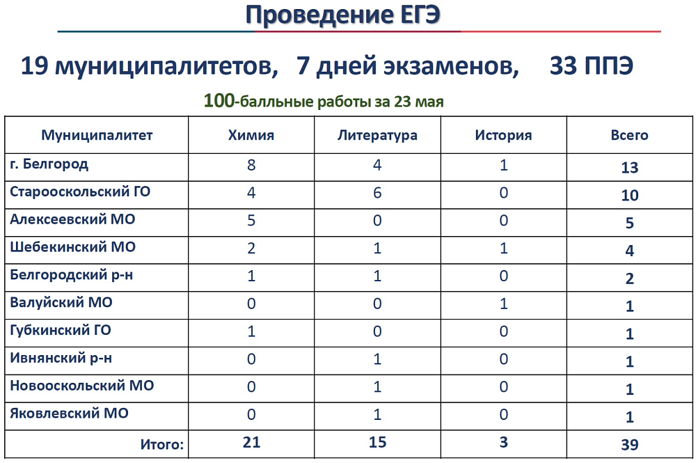 В Белгородской области прошли семь экзаменов ЕГЭ. По данным на 23 мая, 39 выпускников получили 100 баллов. Больше всего стобалльников – по химии: 21 высокобалльная работа. На втором месте – литература (15 работ), на третьем – история (3 работы).