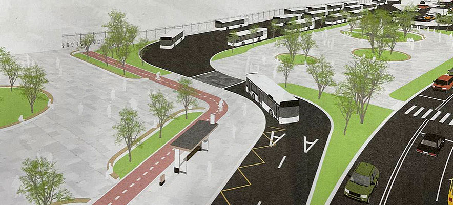Площадка межрейсового отстоя автобусов будет отделена от автомобильного транспорта и размещена по линии всего здания вокзала. Остановки общественного транспорта расположатся отдельно от площадки отстоя и вынесены максимально близко к прибывшим пассажирам. Появится три отдельных автостоянки, в том числе платная большая парковка, размеры которой увеличатся до 100 мест. Остальные две парковки для личного авто и такси около торгового центра будут бесплатными.