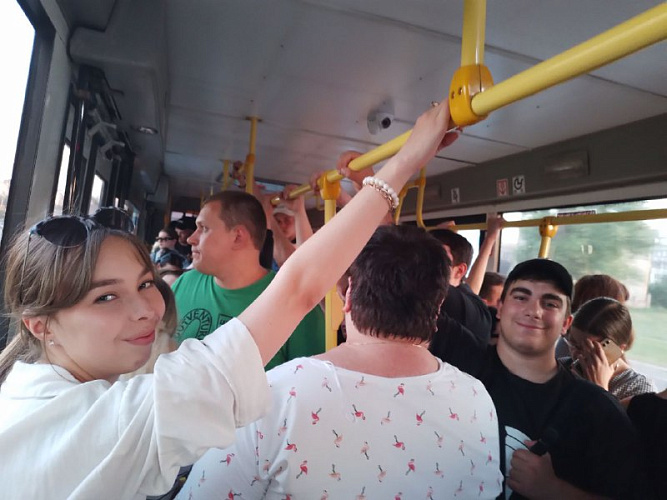 Начнём с того, что к остановке приехал автобус, в котором было 24 сидячих места и 104 стоячих. Это просто капля в море для той толпы, что ждала его на «Энергомаше». И, конечно, никаких сидячих мест уже не было: их заняли пассажиры, которые зашли в автобус по пути его следования от железнодорожного вокзала. Впрочем, стоячих уже скоро тоже не осталось: люди буквально висели друг на друге. А если кто-то убирал ногу, то на место её уже было не поставить. Водитель открывал переднюю дверь, чтобы взять с людей деньги за проезд, а потом просил зайти в автобус то через среднюю дверь, то через заднюю. Но и в середине, и в конце салона места уже не было.
