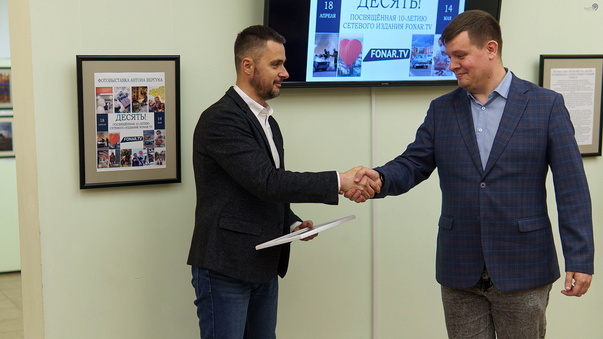 Поздравить Антона Вергуна пришёл заместитель руководителя аппарата администрации города Андрей Черниченко. Он вручил главному редактору Fonar.tv Андрею Маслову благодарственное письмо и книгу-фотоальбом «Белгород: эпоха Победителей».