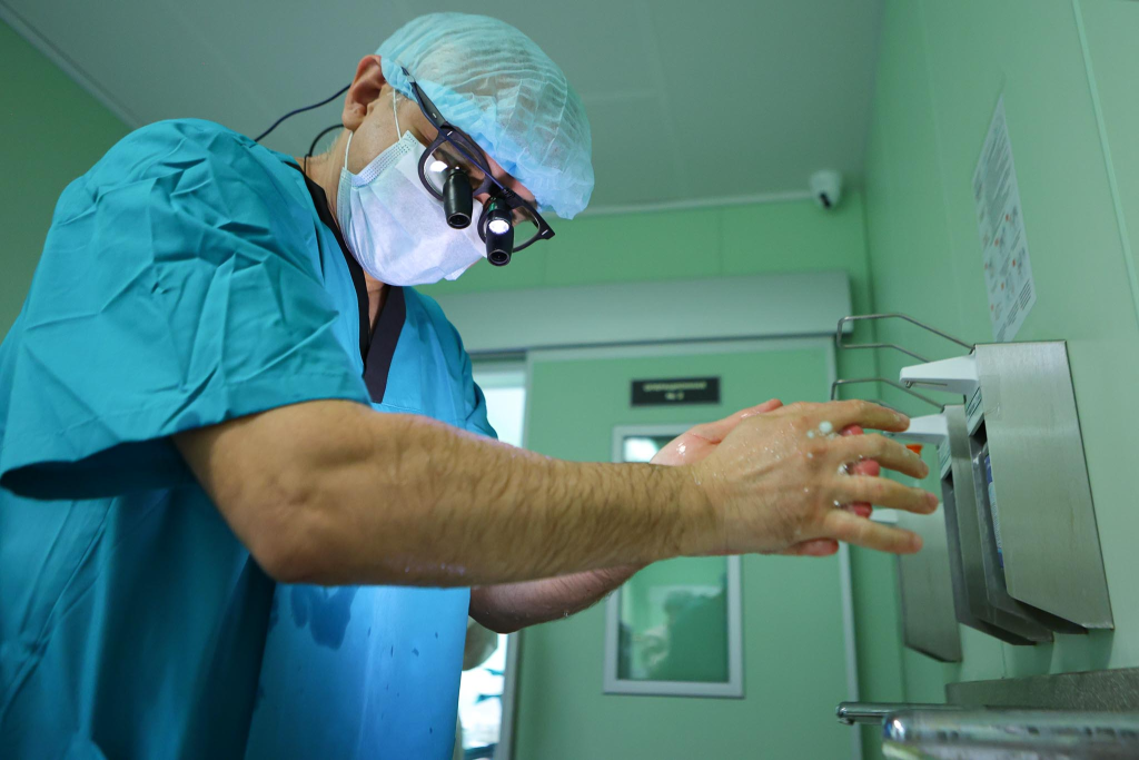 Сперва кардиохирурги надевают специальные очки и фонарик. Одни дают увеличение в 3,5 раза, другой – независимый луч света. А врачи, моющие руки перед операцией, могут показывать мастер-класс самому большому любителю чистоты. Два раза очень тщательно с мылом под струей воды, потом лёгкими похлопываниями бумажных салфеток убираются остатки воды. А потом по комнате плывёт насыщенный запах спирта – они буквально окунают руку в него. Всё, больше ничего трогать голыми руками нельзя. Кардиохирург ждёт, пока спирт испарится. Хирургический халат и медицинские перчатки на него надевает медсестра.